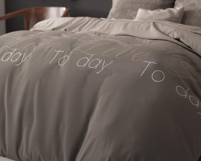 Haal de positieve vibe in je slaapkamer met dit tijdloze en comfortabele Sleeptime Elegance Live Today-dekbedovertrek. Dit overtrek is gegarandeerd een luxe verschijning. Het heeft een mooi dessin waarop de woorden 'Live, today' staan. Deze woorden herrineren je eraan om dagelijks te genieten van het leven. De achterzijde heeft een effen taupekleur. De leuke print komt ook terug op de bijbehorende kussenslopen die standaard meegeleverd worden. Dit dekbedovertrek heeft een totale lengte van 220 cm en kan dankzij de handige drukknopen aan de onderzijde makkelijk afgesloten worden.