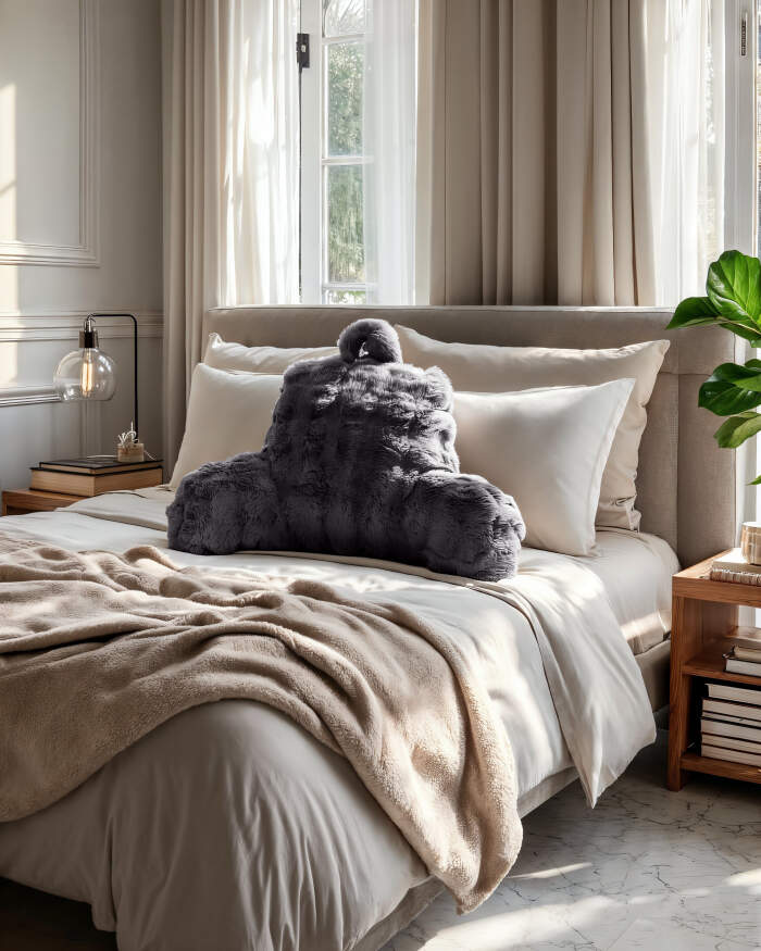 De Bedrest Pompom 34 x 50 van Primaviera Deluxe is ontworpen voor ultiem comfort en een luxe uitstraling. De bovenzijde én onderzijde zijn volledig vervaardigd uit hoogwaardige faux fur-stof met een gewicht van 500 gsm. Dit zorgt voor een bijzonder zachte en warme aanraking, ideaal om heerlijk tegenaan te leunen tijdens lezen, tv-kijken of ontspannen in bed of op de bank.