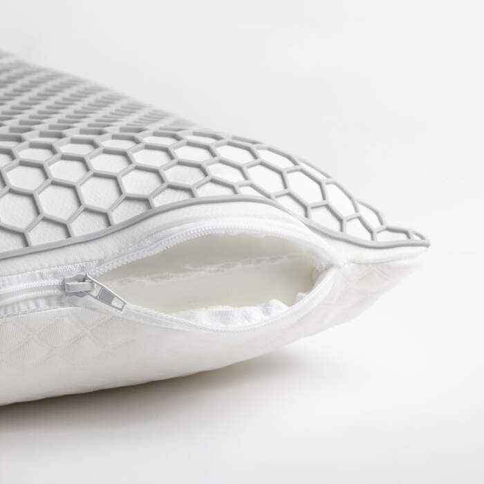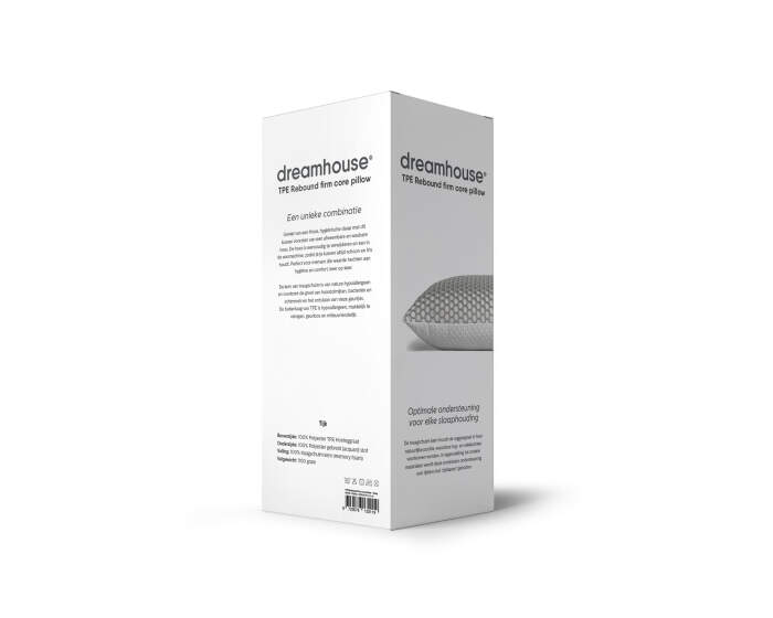 Het TPE Rebound Firm Core Kussen wordt geleverd in een compacte doos met een opgerolde kern en opgevouwen tijk, zodat de kwaliteit van het materiaal tijdens transport behouden blijft. Na het openen trek je de tijk eenvoudig over het kussen en sluit je de rits. De onderzijde van het kussen is afgewerkt met een zachte en slijtvaste gebreide jacquardstof voor een luxe gevoel.