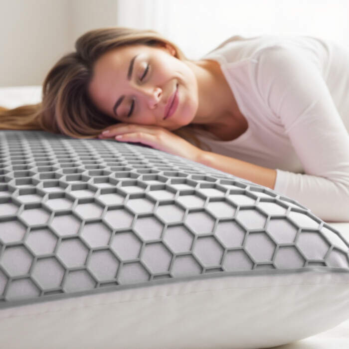 Het TPE Traagschuim Aanpasbaar Kussen combineert innovatieve materialen voor optimaal slaapcomfort. De bovenzijde is voorzien van een open honingraatstructuur uit TPE (thermoplastisch elastomeer), wat zorgt voor een verkoelend effect en uitstekende ventilatie. Hierdoor blijft het kussen aangenaam fris, zelfs tijdens warme nachten. De ademende structuur voorkomt oververhitting en helpt om vocht effectief af te voeren.